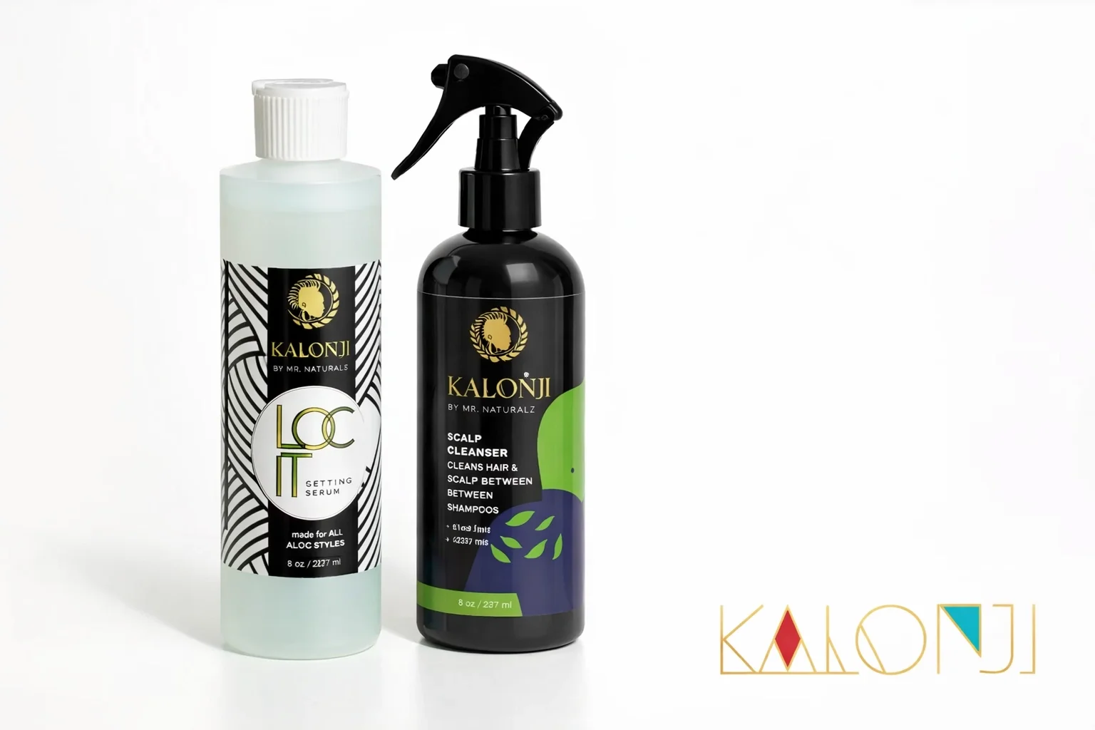 scalp cleanser and loc set serum bottles in black and clear with white background