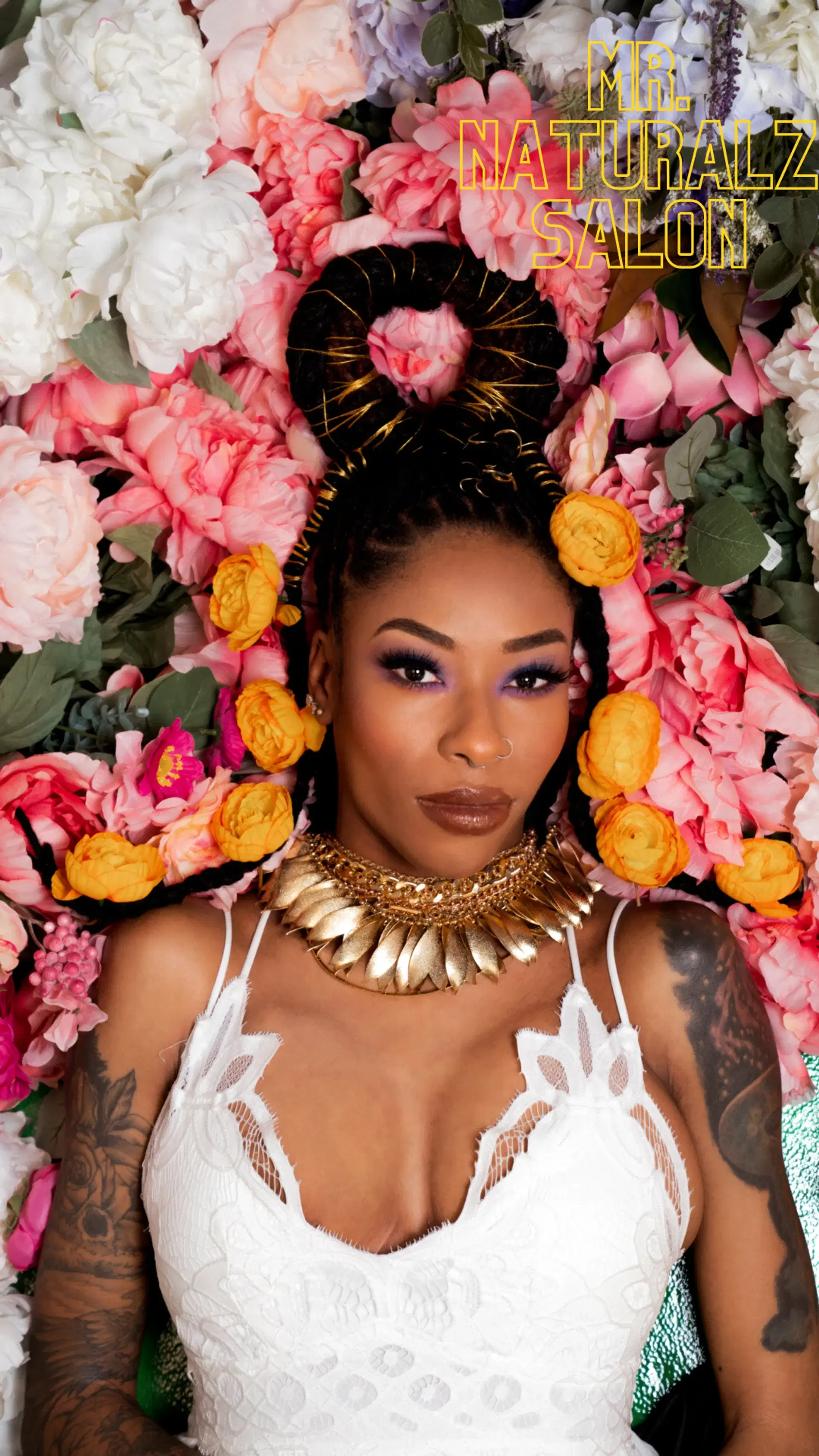 women with locs in white dress, surrounded by flowers, endorned in gold jewelry
