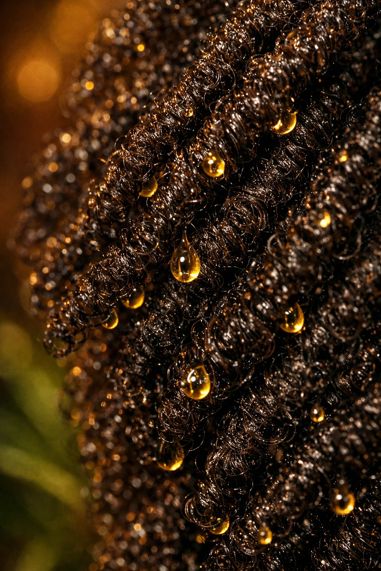 moisturized hair strand up close view with oil dripping