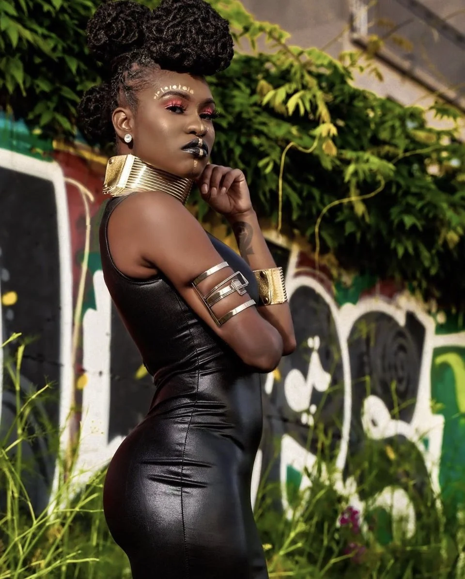 A woman with an intricate natural hair updo and gold statement jewelry posing in front of a graffiti wall, showcasing professional styling from Mr. Naturalz Salon in Seattle.