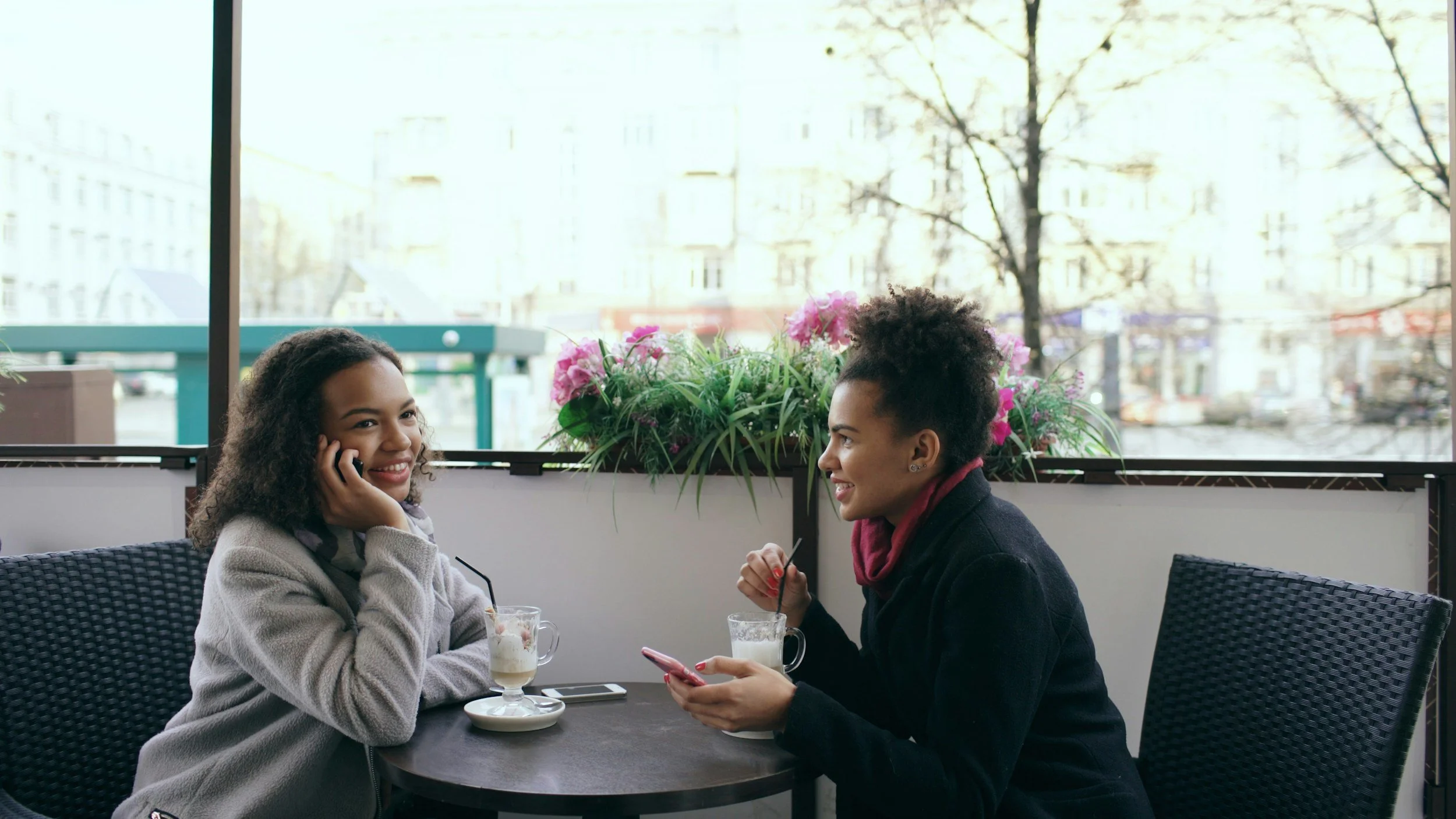 Two women with natural, curly hair sit at an outdoor cafe table in Seattle, smiling and talking while holding their phones. Pink flowers and a blurred city street are in the background, illustrating a high-vibe lifestyle for natural hair care