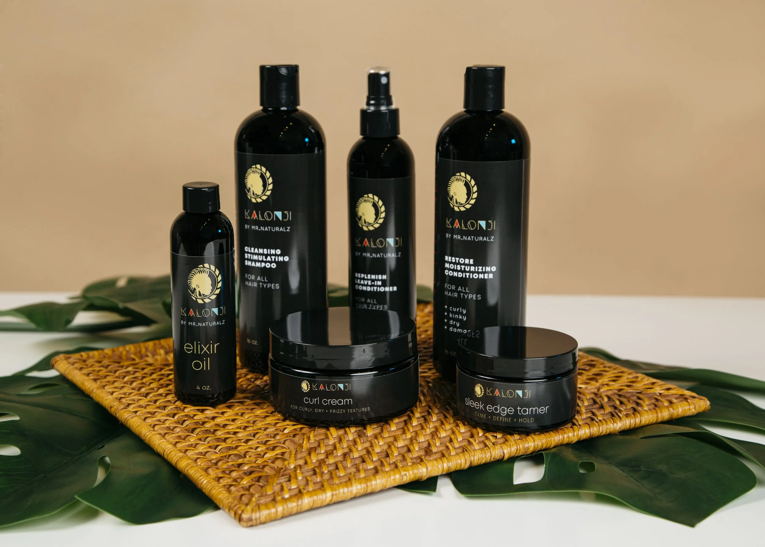 A collection of Kalonji by Mr. Naturalz hair care products, including shampoo, conditioner, curl cream, and edge tamer, arranged on a woven mat with tropical green leaves, highlighting natural hair care solutions for kinky and curly textures.