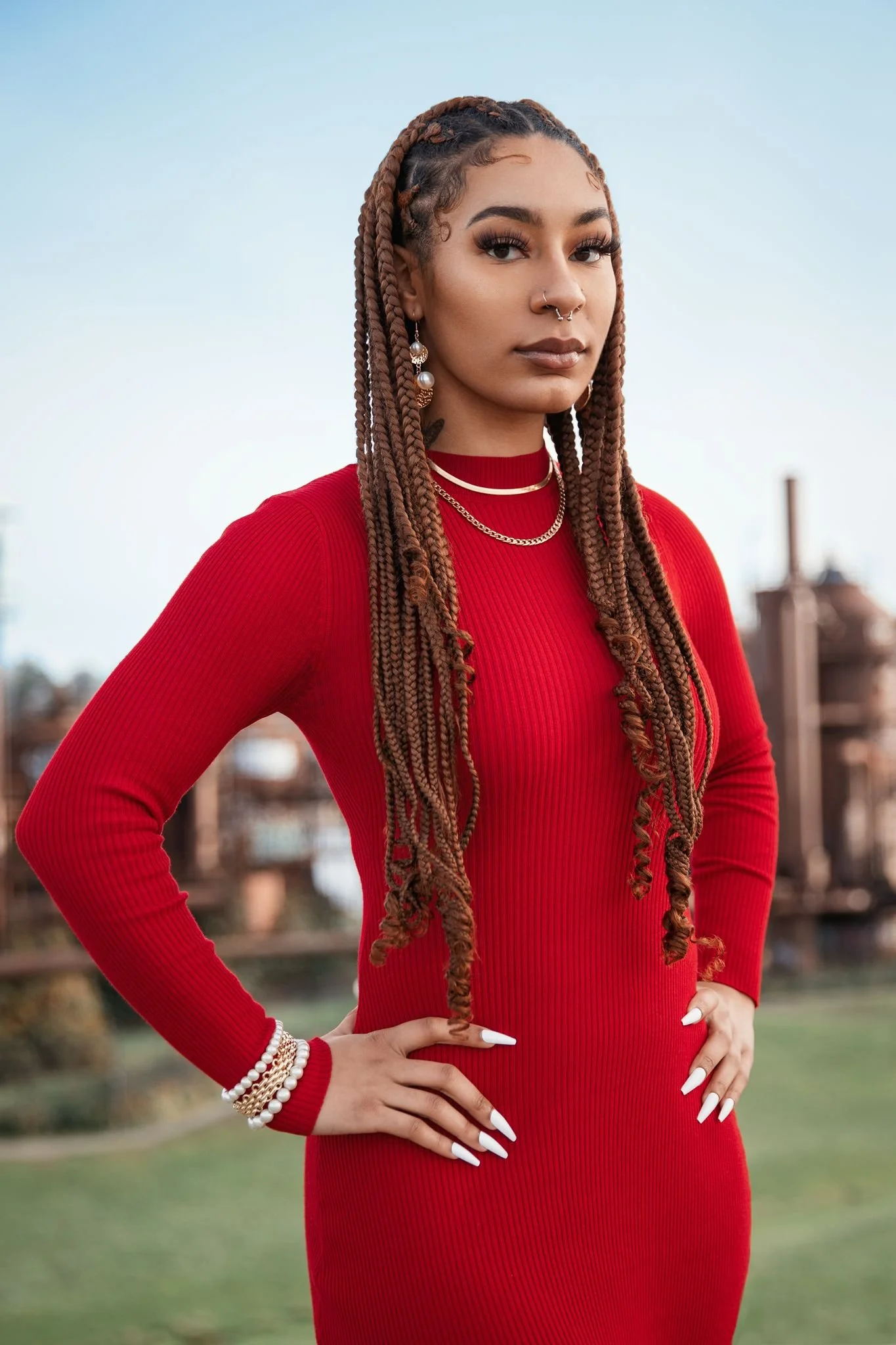 A woman with long, honey-brown waist-length box braids and laid edges wearing a red ribbed turtleneck sweater and gold jewelry, showcasing a professional protective hairstyle for natural hair